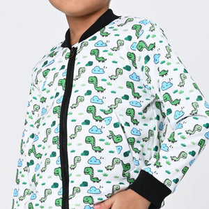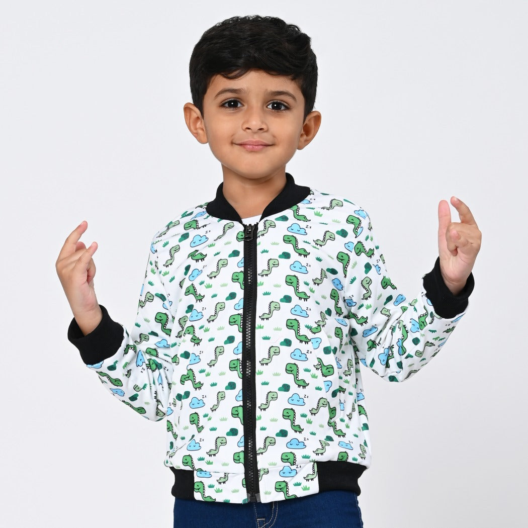 This stylish bomber jacket for kids features a vibrant dinosaur print, perfect for young boys who love adventure and imagination. Crafted from high-quality materials, it ensures comfort and durability, making it an ideal choice for everyday wear. The playful design adds a fun element to any outfit, while the bomber style provides a trendy look that is both fashionable and functional.